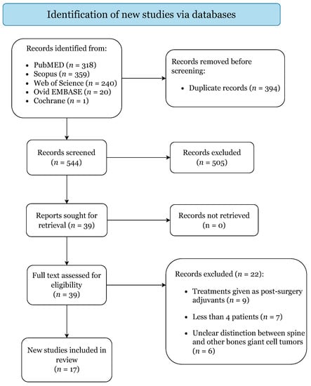 A systematic review was conducted using the Preferred Reporting Items for Systematic Reviews and Meta-Analyses (PRISMA) guidelines [16] and registered to PROSPERO (ID: 303155). PubMed, EMBASE, Scopus, Web-of-Science, and Cochrane were searched from database inception to 30 August 2021, operating the Boolean full-text search (giant cell tumor AND (sacral OR vertebral OR spine OR spinal) AND (radiotherapy OR embolization OR denosumab)). Obtained studies were exported to Mendeley, and duplicates deleted.