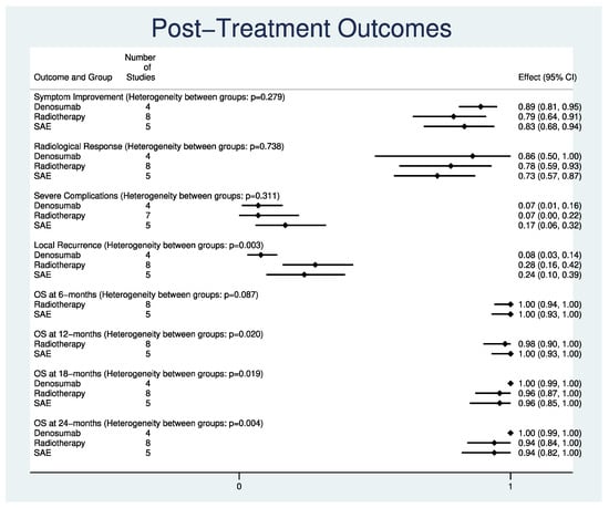 The results of all indirect comparisons between denosumab, radiotherapy, and SAE are summarized in Table 3 and displayed as combined forest plots in Figure 2 (individual forest plots can be found in Supplementary File S4). There were no significant differences in post-treatment symptom improvement (p = 0.279, I2 = 0%), positive radiological responses (p = 0.738, I2 = 56.8%), and severe complications (p = 0.311, I2 = 0%) between the three groups. Rates of local recurrence (p = 0.003; I2 = 32%) and distant metastases (p = 0.002; I2 = 47%) were significantly lower in patients receiving denosumab (ES:0.08, 95%CI:0.03–0.14 for local recurrence; ES:0.00, 95%CI:0.00–0.00 for distant metastases) as compared to radiotherapy (ES:0.28, 95%CI:0.16–0.42; ES: 0.06, 95%CI:0.00–0.21) and SAE (ES:0.24, 95%CI:0.10–0.39; ES:0.04; 95%CI:0.00–0.15).