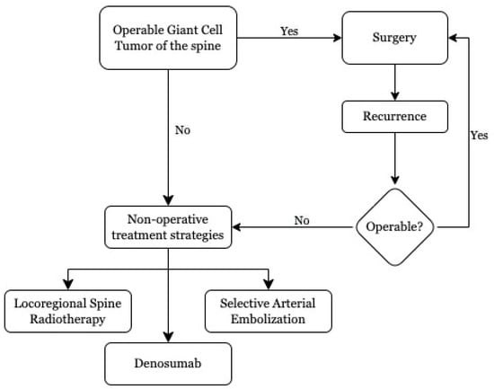 In line with other GCTBs, surgical resection and intralesional curettage constitute the treatments of choice in patients with SGCTs [5] (Figure 3). When feasible, total en-bloc resection is preferred because of its better local tumor control and lower recurrence rates [40,41,42,43]. However, aggressive procedures may result in severe permanent morbidity due to tumor proximity to critical paraspinal neurovascular structures and the risk of causing spine instability, thus necessitating spine fixation along with causing a major clinical burden in young patients. In particular, en-bloc resection of sacral SGCTs often requires sacrifice of the sacral nerve roots, which may lead to major disability with bladder and bowel dysfunction [44,45]. Intralesional curettage correlates with inferior risks of persistent neurological deficits but may still be associated with massive and difficult-to-control intraoperative bleeding and spine instability [4]. Hence, alternative nonoperative treatment options have been evaluated for inoperable SGCTs aimed at achieving favorable outcomes while minimizing the impact on patient neurological status [5,15].