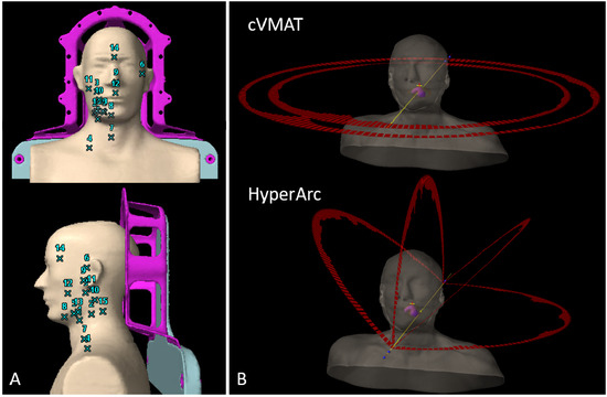 - Rwigema, J.C.; Nguyen, D.; Heron, D.E.; Chen, A.M.; Lee, P.; Wang, P.C.; Vargo, J.A.; Low, D.A.; Huq, M.S.; Tenn, S.; et al. 4pi noncoplanar stereotactic body radiation therapy for head-and-neck cancer: Potential to improve tumor control and late toxicity. Int. J. Radiat. Oncol. Biol. Phys. 2015, 91, 401–409. [Google Scholar] [CrossRef] [PubMed]