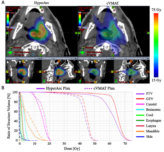 - Gayen, S.; Kombathula, S.H.; Manna, S.; Varshney, S.; Pareek, P. Dosimetric comparison of coplanar and non-coplanar volumetric-modulated arc therapy in head and neck cancer treated with radiotherapy. Radiat. Oncol. J. 2020, 38, 138–147. [Google Scholar] [CrossRef]