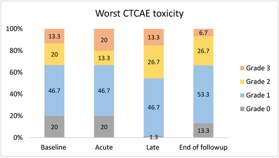Acute and late grade 2 toxicities were 13.3% and 26.7%, and grade 3 toxicities were 20.0% and 13.3%, respectively, as shown in Figure 3. At the end of follow-up, grade 2 and 3 toxicities were 26.7% and 6.7%, respectively. Grade 2 and 3 pre-treatment head and neck morbidities were 20.0% and 13.3%, respectively. Acute and late grade 2 toxicities exceeding baseline were both 6.7% and remained at 6.7% at the end of the follow-up. There was no grade 3 toxicity exceeding baseline at the end of follow-up. Three patients experienced grade 3 acute toxicity (patients #2, #13 and #15, Table 1). However, in two of them (patients #2 and #15), the grade 3 toxicity was present at baseline (dysphagia and dysphagia and dry mouth, respectively). Patient #13 developed grade 3 oral mucositis three weeks after the completion of SBRT, which resolved within one month.