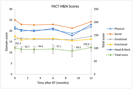 There was an initial decline in mean FACT H&N subdomain scores and total scores post-RT, but these scores recovered to pre-treatment levels after 12 months (mean total scores were 101.3 at screening and 102.6 at 12 months after treatment), as shown in Figure 4. There was no statistically or clinically significant change in the mean HNC-specific subscale score or the FACT H&N total score at any time point after RT (p = 0.91 and 0.80, respectively).