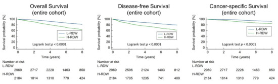 Overall survival, disease-free survival, and cancer-specific survival stratified by RDW after propensity-score matching.
