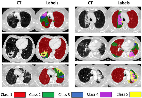 We have proposed a novel classification of lung parenchyma texture at the voxel-wise level and developed a deep learning-based method of its automated annotation. Following a detailed study of the texture changes seen in our patient cohort, and a review of established classifications in the literature [17,18,20,21,27,28,29,30,31,32], we devised a five-class classification based on the morphology and texture of the lung parenchyma. The full details are presented in our accompanying paper in this Special Issue [25]. Table 3 lists the different classes and Figure 1 shows examples of the classes on several CT slices.