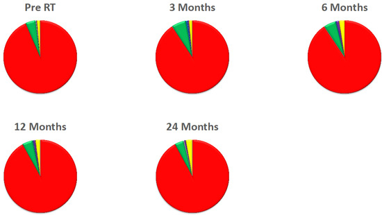 Figure 7 represents the relationship between the local dose and the distribution of the tissue classes, and how this changed over the different timepoints. It can be seen that the prevalence of tissue Classes 2–5 increases more in regions of higher dose, and remains fairly constant in regions of low dose, indicating that the changes to the tissue classes are indeed caused by radiation. It can also be seen that the dose response and temporal evolution is different for the different tissue classes. There is an initial increase in Class 2 at 3 months, which is approximately linearly related to local dose, and then a gradual decrease over later timepoints. There is also an increase in Class 3 at 3 months, but this occurs more evenly over the mid- and high-dose regions, and then rapidly decreases at later time points. Likewise, Class 4 increases at 3 months in the mid- and high-dose regions, but interestingly, decreases in the mid-dose regions but continues to increase in the high-dose regions at 6 months, and then gradually decreases in all regions at 12 and 24 months. Class 5 increases over all time points, but at 3 months, the increase is approximately the same in the mid- and high-dose regions, whereas at later time points, there is an increasingly linear relationship between the increase in Class 5 and the local dose.