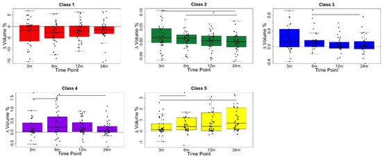 Figure 4 shows a boxplot for each parenchymal class, presenting the difference in the relative volume of that class between each of the follow-up CT scans and the pre-RT scan for the 45 patients that were successfully registered. Each of the classes displays its own distinctive temporal pattern. Prevalence of Class 1, which best represents undamaged tissue, shows a consistent decrease compared to pre-RT. This is most pronounced at 6 months and then gradually returns towards baseline at later timepoints. Classes 2 and 3, which represent ground glass and are, therefore, radiological markers of pneumonitis, are most prevalent at 3–6 months and then return towards baseline values at 24 months. Classes 4 and 5, which represent more solid textured parenchyma, behave differently from each other. Class 4 peaks at 6 months, while Class 5 continues to increase in prevalence up to 24 months. The latter correlates with the increased incidence of late lung fibrosis and collapse. The former may be an intermediary stage between the more acute Classes (2 and 3) and Class 5, representing evolving fibrosis. Friedman tests showed that there were statistically significant differences between the volumes at the time points connected by a horizontal line.