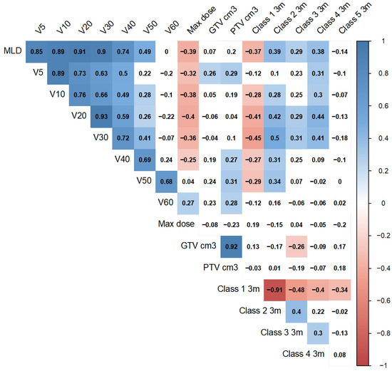 Figure 5 shows a Pearson correlation matrix for a number of global dose metrics and the relative volume changes of the different tissue classes at 3 months. Mild to moderate correlations are seen (up to r = 0.5). As expected, volume of Class 1 is negatively correlated with dose, while the other tissue classes show a positive correlation. The strongest correlation between the tissue classes is a negative correlation (r = −0.91) between the volumes of Class 1 and Class 2, suggesting that the decrease in default lung tissue at 3 months is mostly a result of an increase in ground glass texture (a classical radiological hallmark of radiation pneumonitis). The dosimetric variables that most strongly correlated with change in tissue class volume are lung V20–V50 Gy and mean lung dose. Lung V30 Gy was correlated with change in Classes 1, 2, 3 and 4 with r values of −0.45, 0.5, 0.31 and 0.42, respectively. Change in Class 5 shows the least strong correlations with global dose. Similar patterns are seen at other follow-up time points (see Figures S1–S3).