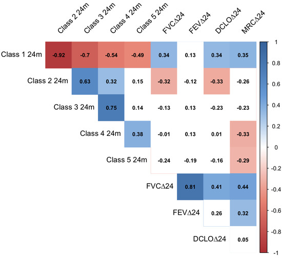 Figure 6 shows a Pearson correlation matrix presenting the relationship between change in respiratory outcome metrics between baseline and 24 months and the changes in volume of tissue classes at 24 months. A moderate correlation was seen between change in Classes 1 and 2, and changes in the FVC, DCLO and MRC dyspnoea score. A weak correlation was observed between changes in volume of Classes 4 and 5 and changes in the MRC dyspnoea score. However, at earlier time points, the correlations were weaker. See Figures S4–S6 for the other time points.