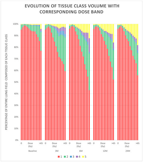 The relationship between the local dose distribution and the tissue classes distribution, and how this changed over the timepoints, was also explored. Each diagnostic CT scan was divided into subvolumes based on the propagated dose distributions, with a subvolume for each 5 Gy physical dose band up to 65 Gy, and then a final subvolume for all lung voxels receiving more than 65 Gy. For each patient and timepoint, the relative volumes of the tissue classes within each subvolume were calculated, and the average values were calculated for all patients. These results were visualised and qualitatively analysed using a stacked bar graph.