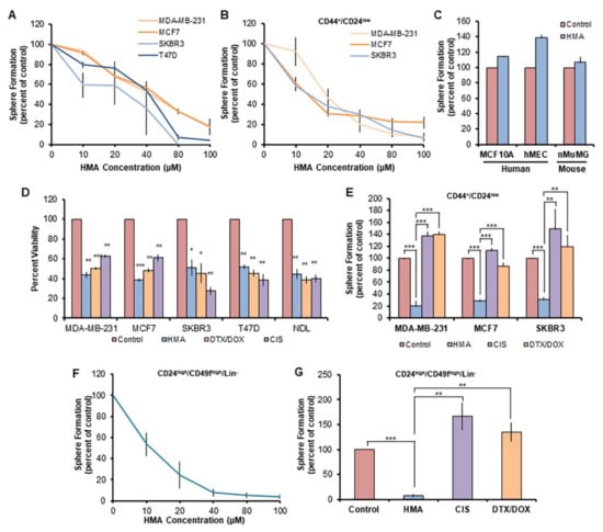 To assess the ability of HMA to specifically eradicate breast CSCs (BCSCs), we first examined the impact of HMA pretreatment on secondary sphere formation [43,44,45] by cultured human breast cancer cell lines. We observed that the EC50s for HMA-mediated tumorsphere suppression toward bulk populations of MDA-MB-231 (ER/PR/HER2-), MCF7 and T47D (ER/PR+), and SKBR3 (HER2+) human breast cancer cell lines (see Table S1) are essentially identical to each other (Figure 1A) and identical to the EC50s we previously reported for HMA cytotoxicity toward the total populations of these cell lines [17]. Likewise, CD44+/CD24low-sorted (see Figure S1A) MDA-MB-231, MCF7, and SKBR3 BCSC-enriched subpopulations are similarly sensitive to HMA (Figure 1B). In contrast, EC50 levels of HMA did not reduce secondary sphere formation by the non-tumorigenic mammary epithelial human breast MCF10A and HMEC and mouse mammary nMuMG cell lines (Figure 1C). These observations confirm the hypothesis that HMA is similarly cytotoxic toward BCSC subpopulations and bulk populations and point to the existence of a therapeutic window that could circumvent a substantial barrier to CSC-targeted therapeutic development [46].