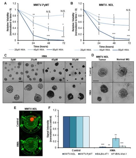 To evaluate HMA’s efficacy in more physiologically relevant systems recapitulating the complexities of the in vivo environment, we adapted an ex vivo primary tumor organoid model [37] to incorporate fundamental properties of tissue architecture using the MMTV-NDL and MMTV-PyMT transgenic mouse models of breast cancer [47,50]. Fresh tumor tissues were dissociated to single cells and embedded in a three-dimensional Matrigel scaffold for 7-day culture to produce tumor organoids. Organoid viability over the course of subsequent 72 h HMA treatment was monitored in real time with the use of a non-lytic, bioluminescent method. We observed that HMA dramatically reduces both MMTV-PyMT (Figure 3A) and MMTV-NDL (Figure 3B) organoid viability over time, which can be distinguished by a dramatic change in organoid morphology and loss of structural integrity by brightfield imaging (Figure 3C,D). In contrast to the marked reduction in tumor-derived organoid viability observed in response to HMA (Figure 3D, left panels), the viability and morphology of organoids generated from matched normal FVB/NJ mouse mammary glands were unaffected by HMA treatment over 48 h (Figure 3D, right panels).