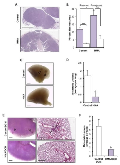 3.4. HMA Induces Necrosis In Vivo and Suppresses Metastasis