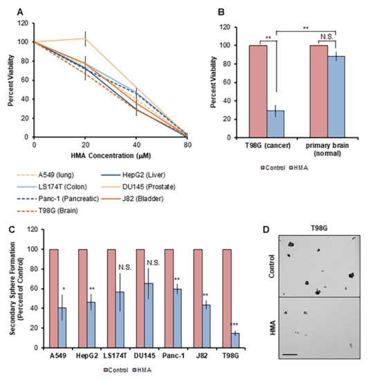 Considering the remarkable consistency of HMA’s cytotoxic effects in diverse breast cancer cell lines and tissues as described here and in our previous report [17], we investigated whether HMA might be utilized as a pan-therapeutic for malignancies arising from other tissues. To address this question, we tested the impact of HMA on transformed human cell lines derived from an array of solid tissue tumor types (Table S2). T98G, Du145, A549, HepG2, J82, LS174T, Panc-1, and SKOV3 cell lines all demonstrated a dose-dependent response to HMA (Figure 5A) and exhibited EC50 values very similar to bulk breast cancer cell lines and BCSCs. Notably, HMA is cytotoxic toward T98G cells derived from glioblastoma, an aggressive form of brain cancer with a poor clinical prognosis due to a distinct lack of therapeutic options [54,55], but not toward cells dissociated from fresh mouse brain tissue (Figure 5B).
