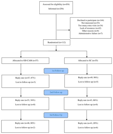 The reply rate in the study was high, with 87% and 98% at first follow-up (8 weeks), 94% and 86% at second follow-up (12 weeks) and 88% and 89% at third follow-up (24 weeks) for OD-CAM and SC, respectively (see Figure 1).