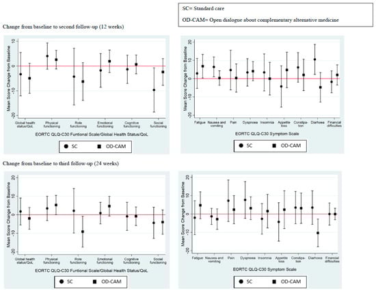 There was no significant difference in QoL between the OD-CAM and SC group at 12- and 24-week follow-ups (Figure 2). Similarly, with only a few exceptions, no significant differences were found within groups during follow-up. From baseline to 12 weeks, a significant difference was shown in the SC group in one function and two symptoms. Social functioning declined by 9.65 points (95% CI: −18.59 to −0.71), diarrhea increased by 10.53 points (95% CI: 2.31–18.74) and nausea and vomiting increased by 6.41 points (95% CI: 0.96–11.86). Within the OD-CAM group, fatigue increased by 6.80 points (95% CI: 0.36–13.24). At 24 weeks, a significant difference was only shown within the OD-CAM group. Physical functioning improved by 5.24 points (95% CI: 0.03–10.44), role functioning decreased by 9.13 (95% CI: −17.47 to −0.78) and diarrhea by 10.32 points (95% CI: −17.86 to −2.77). A remarkable increase of 4.63 points (95% CI: −0.68–9.94) in emotional functioning was shown at 24 weeks in the OD-CAM group. No statistically significant differences were found within the SC group from baseline to third follow-up (Figure 2).