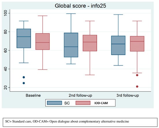 In general, the INFO25 median scores were lower in the SC group compared to the OD-CAM group during follow-up, indicating that OD-CAM might be superior to SC in providing sufficient information. However, the differences were not statistically significant (see Figure 4).