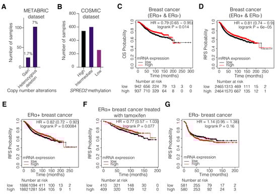 To link SPRED2 to BC, we began by examining the expression levels and the methylation status of SPRED2 in BC patients. For this, we took advantage of the publicly available online databases COSMIC [] and METABRIC [,,]. The METABRIC database is one of the largest breast cancer cohorts to contain gene expression, mutation, and patient outcome data. An analysis of this BC dataset revealed that heterozygous deletions of the SPRED2 gene occur in 7% of the ERα+ samples (103 from a total of 1459 samples) (Figure 1A). According to the COSMIC database, hypermethylation of the SPRED2 gene occurs in approximately 40% of the BC patient samples (545 from a total of 1414 samples) (Figure 1B). The database indicates that the result of this analysis is largely based on methylation at position chr2:65313277, which lies in the 3′UTR and coincides with a CTCF binding site. Hypermethylation is commonly associated with decreased gene expression []. We therefore expect that SPRED2 expression might be compromised in these samples. These data show that expression of SPRED2 might be lower in a large portion of BC patients, suggesting that SPRED2 might play a role as a tumor suppressor in BC as well.