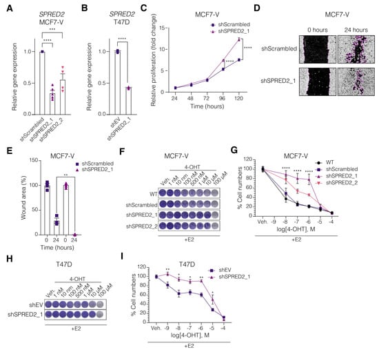 SPRED2 deficiency enhances cell proliferation, migration, and induces resistance to 4-OHT in ERα+ BC cells. (A,B) Bar graphs showing the RT-qPCR quantitation of SPRED2 mRNA levels in cells transduced with viral particles for the expression of two different shRNAs targeting SPRED2 or of a negative control shRNA in MCF7-V (shScrambled) (A) and of the empty vector in T47D (shEV) (B) cells. (C) Relative proliferation of MCF7-V cells expressing shScrambled and shSPRED2, measured with a crystal violet assay in monolayer culture. The numbers of cells for each of them are standardized to the corresponding values at 24 h set to 1. (D) Cell migration assay with MCF7-V cells with and without SPRED2 knockdown. Representative images of the scratch wound areas, outlined with magenta, at the time of the wounding (0 h) and after 24 h. Images of all four replicates (including these) are presented in Figure S2C,D. (E) Bar graphs showing the means of closure for MCF7-V cells. The extent of closure was analyzed with the software ImageJ. (F) Cell growth analyzed by crystal violet staining of MCF7-V cells with and without SPRED2 knockdown and treated with increasing doses of 4-OHT. (G) Dose–response curves of MCF7-V cells treated with increasing doses of 4-OHT. WT, parent MCF7-V cells. (H) Cell growth analyzed by crystal violet staining of T47D cells treated with increasing doses of 4-OHT. (I) Dose–response curves of T47D cells treated with increasing doses of 4-OHT; for panels (F–I), n = 3 independent experiments in triplicates. All error bars represent the standard errors of the means (mean ± SEM). Asterisks indicate significant differences compared to the samples with shScrambled (MCF7-V) or shEV (T47D) (ns for p > 0.05, * p ≤ 0.05, ** p ≤ 0.01, *** p ≤ 0.001 and **** p ≤ 0.0001). Statistical significance was determined with a one-way ANOVA (A), a two-tailed unpaired t-test (B,E), and a two-way ANOVA with Bonferroni multiple comparison test for all other panels.