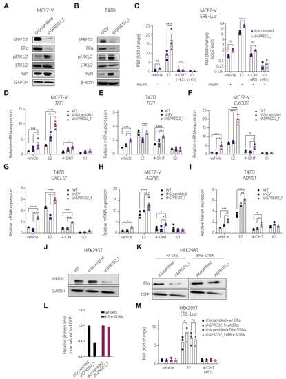 SPRED2 is known from the literature for its role in downregulating the activation of ERK []. For that reason, we thought that the Ras/Raf/MAPK pathway might be involved in the mechanism of 4-OHT resistance. We investigated the status of ERK1/2 in SPRED2-deficient cells by immunoblotting and found that ERK1/2 was highly phosphorylated in cells where SPRED2 was depleted (Figure 3A,B and Figure S2A). The expression levels of the ERK target genes ETV4 and ETV5 [] were significantly upregulated in these cells, as measured by quantitative RT-qPCR, confirming that ERK1/2 is more active in SPRED2-deficient cells (Figure S3G). In addition, we performed a luciferase reporter assay to assess the activity of the transcription factor AP-1, a well-known ERK1/2 target []; this experiment revealed that AP-1, without any specific stimulation, is significantly more active after SPRED2 depletion (Figure S3H). As a result, the increased activation of ERα could be due to its phosphorylation by ERK in a ligand-independent manner []. To test this, we co-transfected the negative control (shScrambled) and SPRED2-deficient HEK293T cells, which do not express ERα, with expression vectors for wild-type ERα or for the ERα S118A mutant, and with the EREtkluc reporter plasmid and an EGFP expression vector as the internal standard (Figure 3J,K). The protein levels of wild-type ERα were lower in the SPRED2-deficient cells, as shown by immunoblotting, indicating that ERα might be more active (Figure 3K,L). Remarkably, the protein levels of ERα S118A were not affected and were similar to the ones of the control (Figure 3K,L). Measuring the activity of ERα with a luciferase reporter assay revealed that SPRED2 depletion resulted in a significant additional stimulation of the E2-induced ERα activity, while this stimulation seems to be compromised for the S118A mutant (Figure 3M). However, we did not observe any increase in the basal ERα activity in SPRED2-depleted HEK293T cells, in contrast to what we had observed in BC cells. The latter could be due to different experimental conditions such as the cell line used or whether the ERα is expressed endogenously (BC) or by transient transfection (HEK293T). These results demonstrate that ERα is more active upon SPRED2 depletion and that the phosphorylation of S118 plays a critical role for this stimulation.