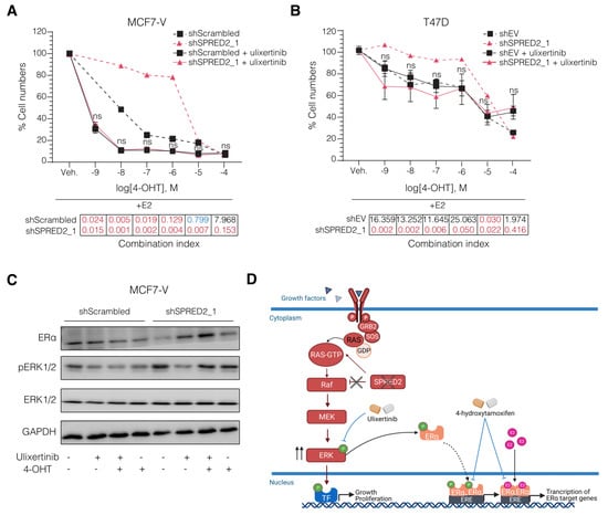 Ulixertinib resensitizes SPRED2-deficient BC cells to 4-OHT. (A,B) Dose–response curves with increasing doses of 4-OHT in combination with ulixertinib at 100 nM for MCF7-V (A) and 300 nM for T47D (B). The dashed curves indicate the response to 4-OHT without ulixertinib, copied from Figure 2G,I for comparison. Statistical significance was determined with a two-way ANOVA with Bonferroni multiple comparison test for both panels. All error bars represent the standard errors of the means (mean ± SEM). Significance is indicated compared to the shScrambled (MCF7-V) or shEV (T47D) samples, each treated with ulixertinib (ns for p > 0.05). Tables below the curves indicate the combination index of 4-OHT with ulixertinib for each dose, categorized as very strong synergism (red), moderate synergism (blue), and strong antagonism (black), calculated by the Chou-Talalay method with the software CompuSyn. (C) Representative immunoblots showing the changes in ERα and p-ERK protein levels of MCF7-V cells after treatment with 4-OHT and ulixertinib alone or in combination. (D) Schematic representation of the proposed mechanism driving 4-OHT resistance in SPRED2 deficiency and how to overcome it. The illustration was created with BioRender.com. Uncropped images of immunoblots with molecular weight standards are available in Figure S5.