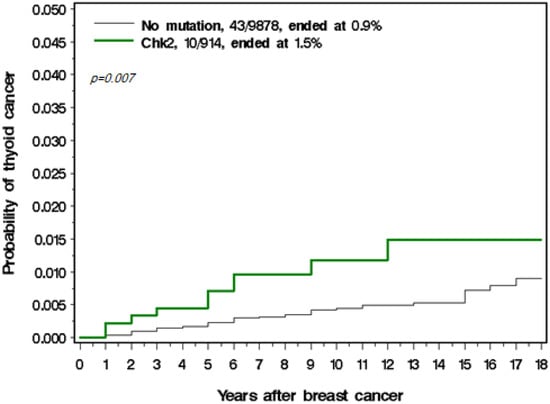 These results suggest that screening for thyroid cancer among breast cancer patients with a CHEK2 mutation might be warranted. Routine thyroid ultrasonography detects thyroid nodules in 8% of breast cancer patients [22,23]. It is not clear if thyroid cancer screening reduces mortality (which is low), and issues of over-diagnosis have been raised. Further, the risk of thyroid cancers in the CHEK2 carriers was only 1.5% over ten years.