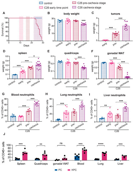 Immune changes during cancer progression in mouse models of cachexia. (A) The mice were injected with C26 colorectal cancer cells and sacrificed at three distinct time points: an early time point (9–10 days post-tumor inoculation), the pre-cachectic stage (15–16 days post-injection), and when cachexia occurred (≥21 days post-injection); (B–F) The body (B), tumor (C), spleen (D), quadriceps (E), and gonadal white adipose tissue (gWAT) (F) weights of mice that were sacrificed at the time points that are defined in Figure 1A; (G–I) Quantification of neutrophils (displayed as % of neutrophils out of all CD45+ cells), by flow cytometry in the blood (G), lung (H), and liver (I) of mice that were sacrificed at the time points that are defined in Figure 1A; (J) Quantification of neutrophils (displayed as % of neutrophils out of all CD45+ cells) in the spleen, quadriceps, gWAT, blood, lung, and liver of pre-cachectic KPC mice and the PC controls. The data are expressed as the mean ± SEM. A one-way ANOVA with Tukey’s correction for post hoc testing was used in (B–I). Statistical differences in (J) were examined using unpaired two-tailed Student’s t-test with Welch’s correction. * p-value < 0.05, ** p-value < 0.01, *** p-value < 0.001, **** p-value < 0.0001, ns: not significant.