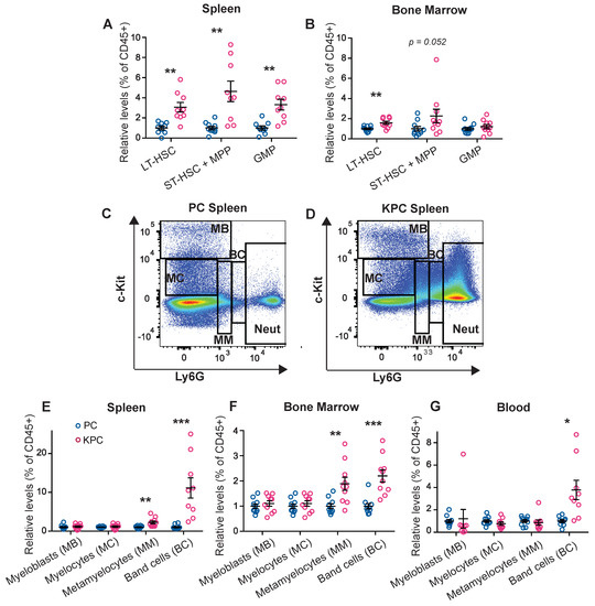 We next performed flow cytometry quantification to investigate the abundance of immune progenitor populations in the spleen and bone marrow, the main hematopoietic organs. The gating strategies that we used have been previously defined [20,21]. Compared to control PC mice, both the long-term (LT) and short-term (ST) hematopoietic stem cell (HSC) populations were increased in the spleen of pre-cachectic KPC mice, along with increased multipotent progenitor (MPP) and granulocyte-monocyte progenitor (GMP) populations; in contrast, only the LT-HSC population was increased in the bone marrow (Figure 2A,B). In the spleens of pre-cachectic KPC mice, we observed a significant increase in immature neutrophils/late progenitor cells, namely metamyelocytes and band cells (Figure 2C–E). Neutrophil late progenitor cell levels were also increased in the blood and bone marrow, although to a lesser extent (Figure 2F,G). The increased spleen size and abundance of splenic HSC and neutrophil progenitor cells suggest that splenic hematopoiesis is the primary origin of systemic neutrophilia in pre-cachectic KPC mice.