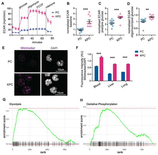 Characterization of immune cell metabolism in the pre-cachectic KPC mice. (A) Extracellular acidification rate (ECAR) of circulating leukocytes from pre-cachectic KPC mice and PC controls that were measured in real-time by Seahorse assay at baseline, after glucose administration, and after treatments with oligomycin, phenylhydrazone (FCCP), and rotenone; (B–D) Normalized ECAR measurements (ratio of compared timepoints) in the circulating leukocytes from mice in Figure 3D at baseline (B), after glucose administration (C), and oligomycin treatment (D); (E) Representative MitoTracker and DAPI immunofluorescence staining in the sorted circulating neutrophils from pre-cachectic KPC mice and PC controls; (F) Quantification of the fluorescence intensity (AU) of MitoTracker staining relative to DAPI staining in circulating, hepatic, and pulmonary neutrophils from mice in (C). (G,H) Gene set enrichment analysis (GSEA) for glycolysis (G) and oxidative phosphorylation (H)-related genes in isolated neutrophils of the KPC compared to the wild-type C57BL/6J mice. The data are expressed as the mean ± SEM. Statistical differences in (B–D,F) were examined using an unpaired two-tailed Student’s t-test with Welch’s correction. Statistical analysis in (G,H) is described in the Methods section. ** p-value < 0.01, *** p-value < 0.001.