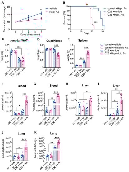 Effects of systemic inhibition of aerobic glycolysis on the severity of cancer cachexia. (A) Longitudinal tumor measurements of the C26 mice that were treated with heptelidic acid or the vehicle. The red arrow indicates start of treatment; (B) Overall survival of the C26 mice and littermates treated with heptelidic acid or vehicle; (C–E) The tissue weights of gonadal white adipose tissue (gWAT) (C), quadriceps (D), and spleen (E) of time-matched mice in (A); (F–K) Quantification of leukocyte (F,H,J) and neutrophil (G,I,K) counts in the circulation (F,G), the liver (H,I), and the lungs (J,K) of mice in (A). The data are expressed as the mean ± SEM. Unpaired two-tailed Student’s t-tests were performed at each time point in (A), with the Holm–Šidák method correction for multiple comparisons. Kaplan–Meier curves in (B) were statistically analyzed by using the log-rank (Mantel–Cox) test. A one-way ANOVA with Tukey’s correction for post hoc testing was used in (C–K). * p-value < 0.05, ** p-value < 0.01, *** p-value < 0.001.