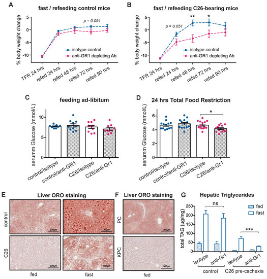 Effect of acute neutrophil depletion during cancer-associated metabolic stress. (A,B) Body weight trajectories after TFR of littermates (A) and pre-cachectic C26 mice (B) that were treated with anti-Gr1 or isotype. (C,D) The glucose levels in C26 mice and littermates that were treated with anti-Gr1 or isotype, when fed ad libitum (C) and after 24 h of total food restriction (TFR) (D); (E,F) Lipid staining by Oil Red O in the liver of fed or fasted pre-cachectic C26 mice and littermates (E) and the fed pre-cachectic KPC mice and the PC controls (F); (G) Quantification of triglycerides by liquid chromatography-mass spectrometry in the liver of fed and fasted pre-cachectic C26 mice and littermates that were treated with anti-Gr1 or isotype. The data are expressed as the mean ± SEM. Unpaired two-tailed Student’s t-tests were performed at each time point in (A,B), with the Holm–Šidák method correction for multiple comparisons. One-way ANOVA with Tukey’s correction for post hoc testing was used in (C,D,G). * p-value < 0.05, ** p-value < 0.01, *** p-value < 0.001, ns: not significant.