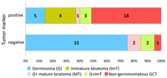 There were 35 cases (45%) where tumor markers were above the diagnostic threshold (HCG > 100 IU/L or AFP > 10 ng/mL) and upfront resection was performed. The majority of these cases (n = 18, 51%) were histopathologically verified as NGGCTs with a malignant component.