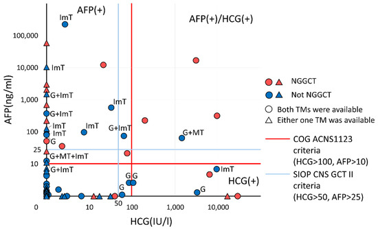 The distribution of human chorionic gonadotropin (HCG) and alpha fetoprotein (AFP) levels are plotted for 77 cases with accessible laboratory data as well as tissue diagnosis from a resection specimen. The red line indicates the criteria in COG ACNS 1123, and the blue line indicates that in SIOP CNS GCT II. No single line completely segregates germ cell tumor (GCT) cases without malignant components. TM: tumor marker, G: germinoma, MT: mature teratoma, ImT: immature teratoma, NGGCT: non-germinomatous GCT.
