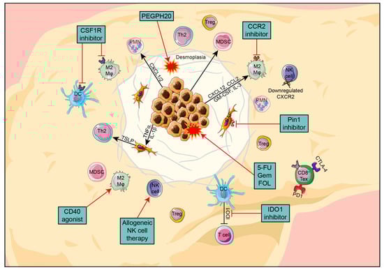 Moreover, part of the dysfunctional immune response in PDAC is due to suppressive immune cells, regulated by various cytokines, chemokines and their receptors, providing potential therapeutic targets []. The importance of myeloid cells is exemplified by agonistic CD40 therapy, which has been shown to convert macrophages into a more tumoricidal phenotype, resulting in a short-term clinical response []. The most clinically advanced target of myeloid cells is CCR2, a chemokine receptor responsible for the recruitment of inhibitory macrophages in the TME which is associated with poor prognosis []. In murine models of PDAC, CCR2 inhibition has been shown to improve the response to chemotherapy, inhibit metastasis spread and block monocyte recruitment which increased T cell immune infiltration []. The CCR2 inhibitor PF-04136309 underwent a phase I study in PDAC patients treated with FOLFIRINOX and resulted in an objective response in almost half of the patients []. Additional cytokine and chemokine receptors have recently drawn attention, such as CSF-1R, the receptor for M-CSF which acts as a key regulator of MDSCs and TAMs in PDAC, as well as CXCR2, which is responsible for neutrophile and MDSC migration. The preclinical analysis of CSF-1R in combination with checkpoint blockade showed promising results []. Moreover, the combination of CSF-1R inhibition with CD40 agonism was able to induce potent T cell-mediated tumor killing in a melanoma model []. The inhibition of CXCR2 alone resulted in enhanced T cell infiltration, and when combined with checkpoint blockade or CSF-1R inhibition, tumor responses were enhanced [,]. Since the cytotoxic activity of NK cells is impaired in PDAC, they may represent potential target cells for the development of new immunotherapies. With this idea in mind, two clinical trials have demonstrated that combining allogeneic NK cell immunotherapy with percutaneous irreversible electroporation increases the DFS and OS of stage III PDAC patients and extends the OS of stage IV PDAC patients []. In mouse models, it has been shown that gemcitabine efficacy was dependent on an increase in NK cell tumor infiltration, together with a decrease in MDSCs []. Therefore, NK cell-targeted immunotherapy seems promising but may require a combination of therapies to overcome the immunosuppression and restore their full activity. Finally, the immunosuppressive enzyme produced by DCs and MDSCs, IDO1, contributes to T cell dysfunction. Hence, a combination of IDO1 inhibition and hyaluronidase resulted in improved T cell infiltration and remission in preclinical models []. Alone or in combination, these molecules promise to improve the dismal prognosis of PDAC, and various combinations are under investigation.