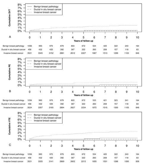 - Brand, J.S.; Hedayati, E.; Bhoo-Pathy, N.; Bergh, J.; Hall, P.; Humphreys, K.; Ludvigsson, J.F.; Czene, K. Time-dependent risk and predictors of ve-nous thromboembolism in breast cancer patients: A population-based cohort study. Cancer 2017, 123, 468–475. [Google Scholar] [CrossRef]