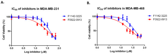 The IC50 plots of F1142-3225 and F0922-0913 on cell proliferation of MDA-MB-231 and MDA-MB-468. Cell proliferation after treatment of MDA-MB-231 (A) or MDA-MB-468 cells (B), with F1142-3225 or F0922-0913 for 4 days. Cell proliferation was determined by cell proliferation reagent WST-1. Data are reported as the mean ± SD (n = 3) of the individual experiments. The experiment was independently repeated three times.