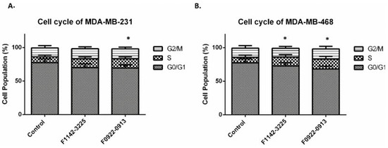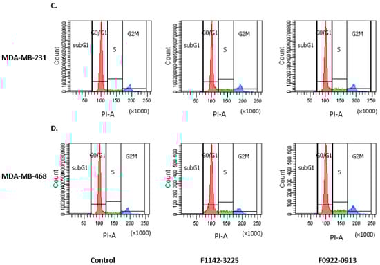 The cell cycle distribution of MDA-MB-231 and MDA-MB-468 cells in response to inhibitors. (A,C) Cell cycle distribution modification, induced by F1142-3225 or F0922-0913 in MDA-MB-231 cells; (B,D) cell cycle distribution, induced by F1142-3225 or F0922-0913 in MDA-MB-468 cells. Data are presented as % of living cells (G0/G1, S, and G2/M cells = 100%). Each value represents the mean of experiments carried out in triplicate (mean ± SD). Statistical significance by one-way ANOVA; * p ˂ 0.05 vs. control (ctrl). Flow cytometry figures depict the cellular distribution in each phase of the cell cycle after treatment.