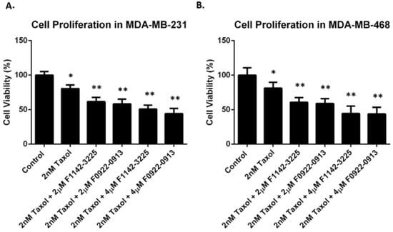 In our study, we verified that the TNBC cells exhibited resistance to taxol, with a concentration higher than 18 nM (Figure S1). In order to limit taxol toxicity, a concentration of 2 nM was selected for this study. MDA-MB-231 and MDA-MB-468 cells were treated with 2 nM taxol, in combination with either F1142-3225 or F0922-0913. Cell proliferation in MDA-MB-231 was decreased by 20% (to 80%) by taxol. However, it was further reduced by 30 (to 50%) and 36% (to 44%), in response to the addition of 4 μM F1142-3225 and F0922-0913, respectively (Figure 4A). Similar trends were observed in MDA-MB-468 cells, where combination treatment of 4 μM F1142-3225 or F0922-0913 and taxol could further decrease proliferation to approximately 44%, which is markedly more significant than the proliferation reduction induced by taxol alone (18.8% reduction) (Figure 4B).