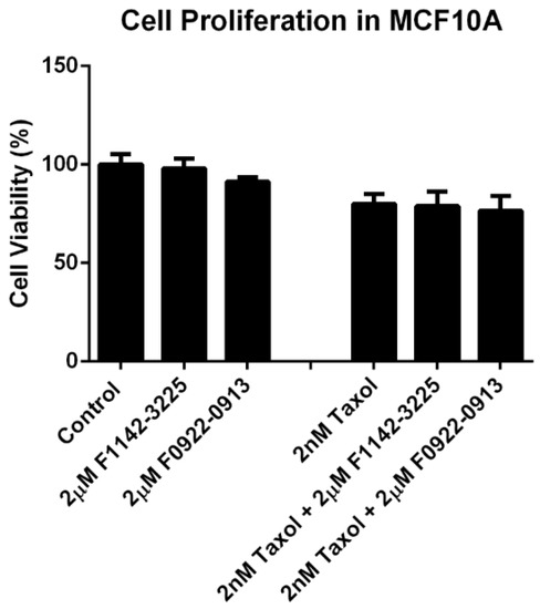 Furthermore, the effect of inhibitors with taxol treatment was also determined in MCF10A cells. It was shown that there was no significant change in proliferation in response to the combination treatment of F1142-3225 or F0922-0913 with taxol (approximately 77.9% vs. 80.0%) (Figure 5). Thus, it was demonstrated that the combined administration of F1142-3225 or F0922-0913 could significantly increase the cells’ sensitivity to taxol in the TNBC cell lines, but not in MCF10A cells.