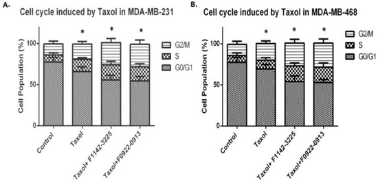 Meanwhile, the cell cycle distribution was analyzed, following the combination treatment of either of these two CRIF1–CDK2 interface inhibitors with taxol. In MDA-MB-231, the percentage of cells in the G2/M phase was increased, in response to taxol treatment (13.2 vs.18.6%). This trend was significantly enhanced by the combined use of taxol with F1142-3225 or F0922-0913 (18.6 vs. 27.4%) (Figure 6A). In MDA-MB-468, the percentage of cells in G2/M phase, following taxol treatment, was 19.9%, and this was increased to approximately 29.2%, in response to the combined treatment with F1142-3225 or F0922-0913 (Figure 6B). It is evident that combined treatment resulted more significant S and G2/M phase increase (compared Figure 6 with Figure 2).
