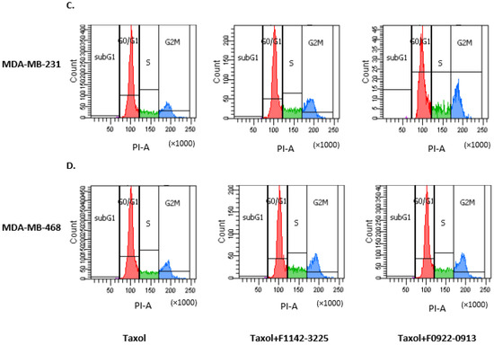 Cell cycle distribution in response to combined treatment of taxol and inhibitors in MDA-MB-231 and MDA-MB-468 cells. (A,C) Cell cycle distribution in response to combination treatment of taxol and either F1142-3225 or F0922-0913 in MDA-MB-231 cells. (B,D) Cell cycle distribution in response to combination treatment of taxol and either F1142-3225 or F0922-0913 in MDA-MB-468 cells. Data are presented as % of living cells (G0/G1, S, and G2/M cells = 100%). Each number represents the mean of experiments, carried out in triplicate (mean ± SD). Statistical sig-nificance was determined by one-way ANOVA; * p ˂ 0.05 vs. control (Ctrl). Flow cytometry figures depict the distribution of each phase of the cell cycle after treatment.