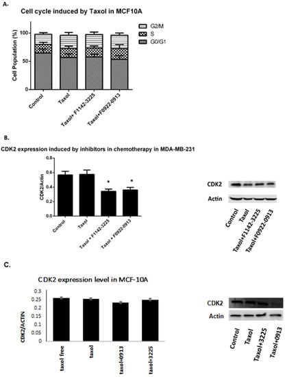 In contrast, in MCF10 cells, there was no significant regulation of G2/M arrest in groups of combination treatments, compared with the cells just treated with taxol (23.6% vs. 23.4%) (Figure 7A). Furthermore, following combination treatment of taxol and the interface inhibitors, CDK2 protein expression was significantly decreased to 59.9%, compared with the group treated with taxol alone (Figure 7B). Thus, it is suggested that the down-regulation of CDK2 in the combined treatment can arrest the TNBC cancer cell cycle and enhance the anti-proliferation effects, imposing a positive effect on the treatments for breast cancer [26,27,28].