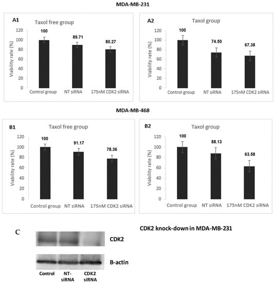 CDK2 knockdown was conducted using small interfering RNA (siRNA) transfection. SiRNA oligos against human CDK2 and non-targeting siRNA were synthesized by oligobio (Table S1). At a density of 3000 cells per well, the two TNBC cell-lines, MDA-MB-231 and MDA-MB-468, and the control cell-line, MCF-10A, were transfected with 175 nM CDK2 siRNA or 100 nM NT siRNA using the Lipofectamine 2000 (Invitrogen, Burlington, ON, Canada), according to the manufacturer’s instructions. After 5 h of treatment with siRNA, the medium was changed, and 2 nM of taxol was added to each treatment group. For each cell-line, the control group was taxol and siRNA free. Experiments were repeated three times for each cell line. Cell medium was changed after 48 h, and the cell proliferation test was conducted after 4 days of treatment.