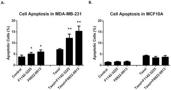 Cell apoptosis induced by the inhibitors with or without taxol in TNBC and MCF10 A cell lines. Cell apoptosis was determined by eBioscienceTM Annexin V Apoptosis Detection kit APC in MDA-MB-231(A) and MCF10A (B) cell lines treated with either F2114-3225 or F0922-0913, in the presence or absence of taxol for 24 h. Data are reported as % of DNA synthesis vs. control (100%). Each point represents the mean of four replications (mean ± SD). Statistical significance by one-way ANOVA; * p ˂ 0.05 vs. control (ctrl); ** p ˂ 0.01 vs. control (ctrl).