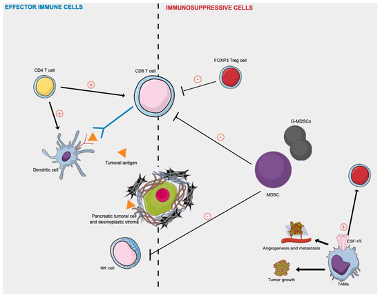 Figure 2 presented afterward summarizes the key effector immune cells and immunosuppressive actors in human PDAC.