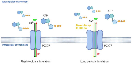 Schematic representation of P2X7 receptor (P2X7R). P2X7R is an ion channel permeable to Na+, K+, and Ca+2. P2X7R physiological stimulation with ATP leads to channel opening for Na+, K+, and Ca+2, while long-term stimulation of P2X7R with ATP causes the opening of a non-selective pore that allows the passage of molecules whose molecular weight is lower than 900 Da.