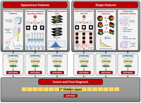 The present diagnostic procedures have the following flaws: (i) some systems ignore any spatial interaction by using HU values as an appearance feature; (ii) some systems are inaccurate due to their sensitivity to segmentation due to the use of simple shape features; (iii) some systems depends on black boxes of Neural Networks, which are very hard to interpret. To avoid all these problems, two groups of features that describe the nodule texture and shape have been developed. The texture appearance features group involves not only the HU value of the voxel, but also its relationship with the surrounding neighbors. The shape features group combines complex and simple shape descriptors in order not to be very sensitive for the segmentation process and capture the general contours look.