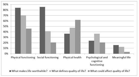 The interview started with the question: What makes life worthwhile? In their answers, 86% of the participants mentioned items that were categorized in the domain of social functioning, with 84% mentioning items in the domain of physical functioning. The categorization of answers into multiple domains was possible.