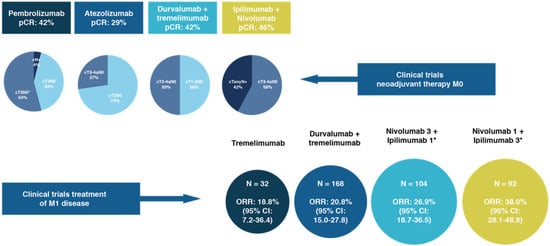 Differences in pCR in clinical trials with neoadjuvant ICIs in M0 patients and ORR in patients with M1 disease treated with ICSs alone or combined, data from [13,52,53,54,55,56,57].