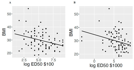 High discounting rate was independently associated with increased BMI (A): ED50 $100, p = 0.002; (B): ED50 $1000, p = 0.008).